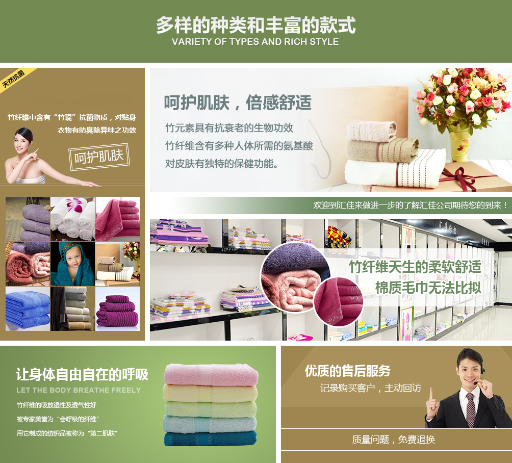 德州匯佳紡織品有限公司專業(yè)生產(chǎn)竹纖維毛巾,是竹纖維毛巾品牌廠家,并且提供竹纖維毛巾禮盒套裝用于福利和禮品。公司座落于山東德州,交通十分便利,公司近臨京滬高速公路,距離德州火車站、汽車站10公里京滬高鐵5公里,濟(jì)南國際機場120公里。